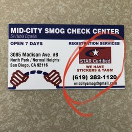 Mid-City Smog Check is STAR certified checked and approved by the California DMV. Located close to the North Park area of San Diego. Best to call ahead for appointment and speak to the owner Jimmy. Received the notice from DMV for the annual registration and my car needed a smog test...ugh! I'm still not familiar with the San Diego areas and don't know too many locals for referrals. Thanks to YELP, after searching and reading some credible reviews, I decided on Mid-City Smog. I called and Jimmy said he didn't need the DMV paperwork, everything is computerized and his shop was less than 10 minute drive from Mission Hills. The shop is not fancy, but it got the work done in under 15 minutes. My Mercedes is an AMG, 8 cylinder monster. Some smog shops in LA claimed my car didn't pass the smog test so I was nervous, but also later learned those shops lied and my reviews on them will be posted later. Here, at Mid-City Smog check, the smog check process was easy and Jimmy was professional, courteous and nice. After passing the smog test, it was sixty-five dollars which about the same cost in West Los Angeles and definitely worth it! For a headache free smog check test experience, Mid-City Smog Check gets my Recommendation!!